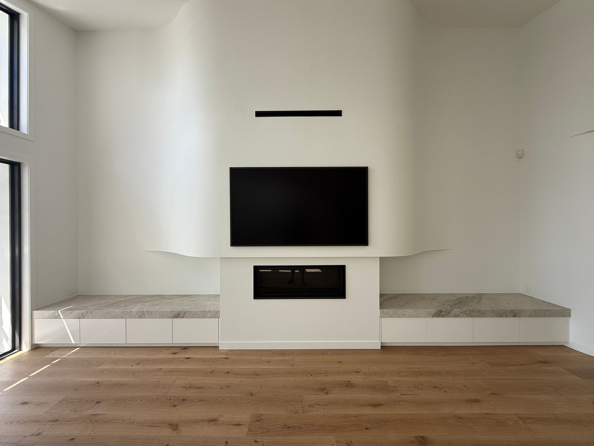 With its bold bending and elegant contrast, Aspen White brings a timeless yet modern touch to this space — perfectly showcased on the waterfall island and benchtops.
